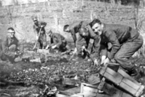 Sadzenie drzewek. Bartoszyce 1966-1968. Z prawej 1 Edmund Sikorski, 3 z prawej pochylony, ciemne włosy, z łopatą Alek Popiełuszko (ks. Jerzy Popiełuszko). 1 z lewej Józef Skorupa, 2 z lewej z łopatą Kazimierz Sawostianiuk.