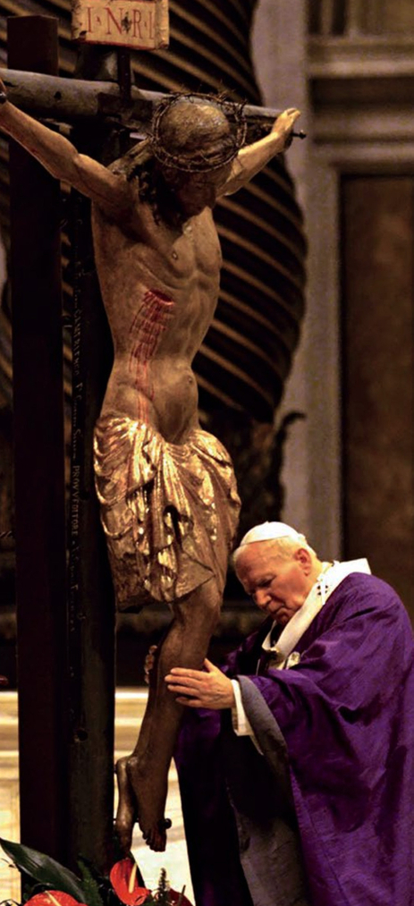 Na zakończenie ceremonii Jan Paweł II podszedł do krucyfiksu i ucałował znajdującą się na nim figurę Chrystusa. Stał tam dłuższą chwilę, wpatrując się w wizerunek Ukrzyżowanego. Postawa papieża nadawała głębię jego działaniu i aż „krzyczała”, że ten akt pokuty stanowił głęboko ewangeliczny gest. Wymowa tej liturgii była więc oczywista: wydarzenia ad extra wiodły do tego, co było ad intra, do wewnętrznego nawrócenia.