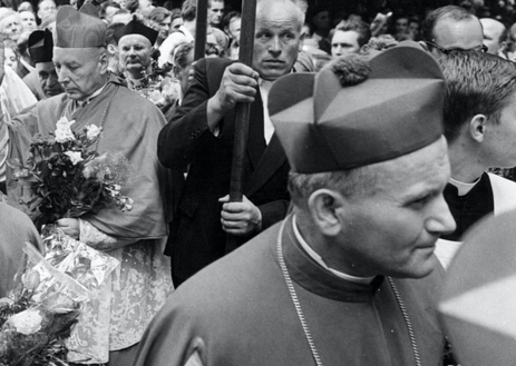 Obchody tysiąclecia chrztu Polski 3 lipca 1966 r. w Sandomierzu. Widoczni m.in.: metropolita krakowski abp Karol Wojtyła (pierwszy z prawej), prymas Polski kard. Stefan Wyszyński (pod baldachimem); za prymasem stoi jego sekretarz ks. Władysław Padacz. Fot. NAC